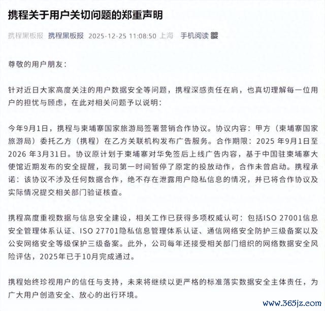 携程发布声明:与柬埔寨国度旅游局签署的营销合营未尝驱动,条约不触及任何数据合营,不存在表现用户诡秘